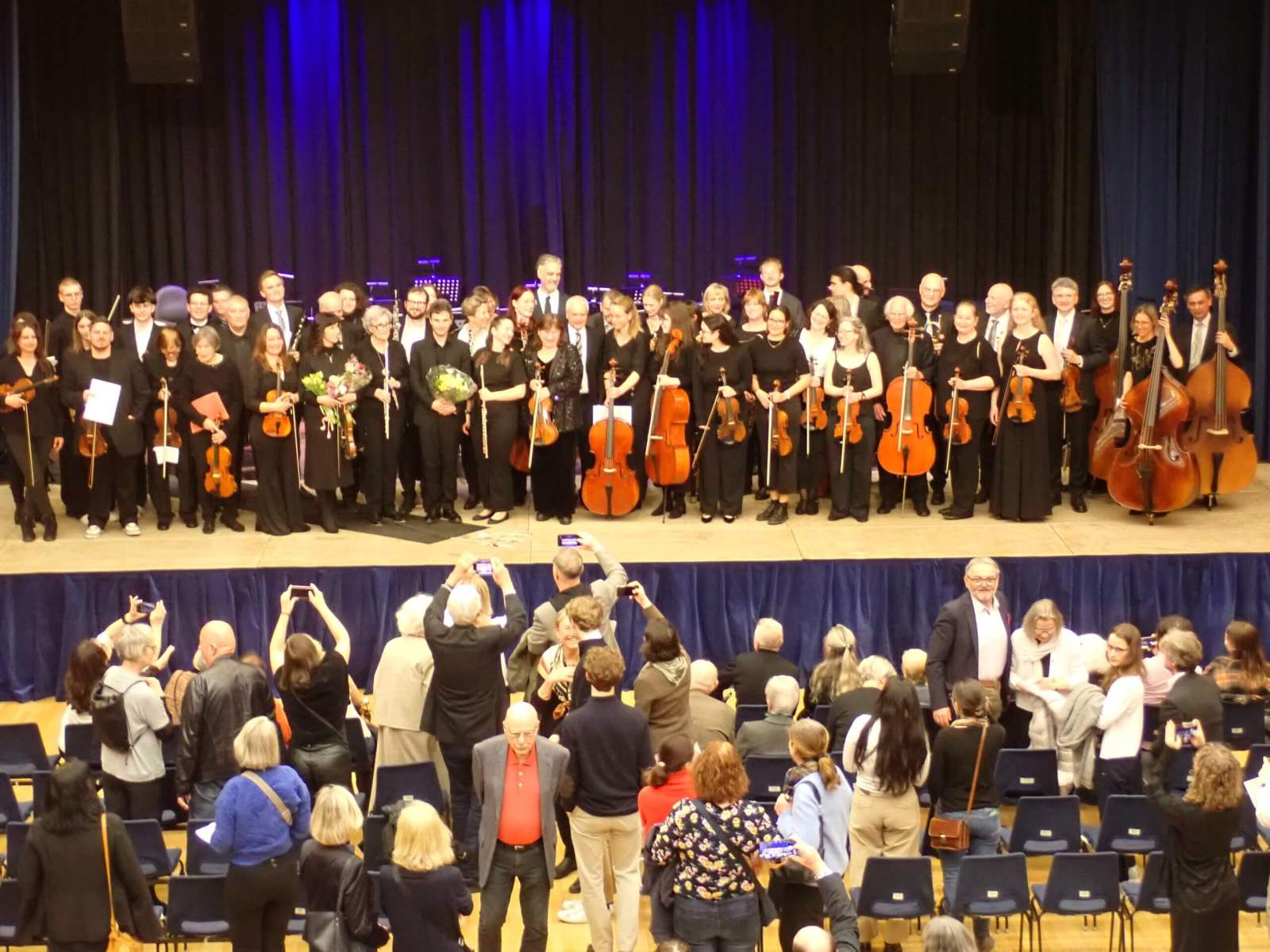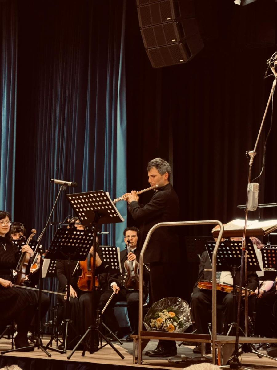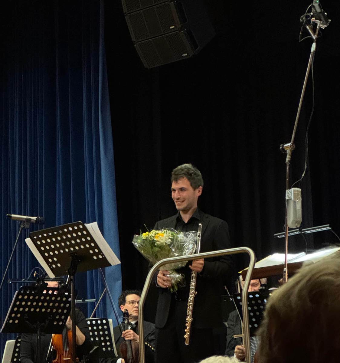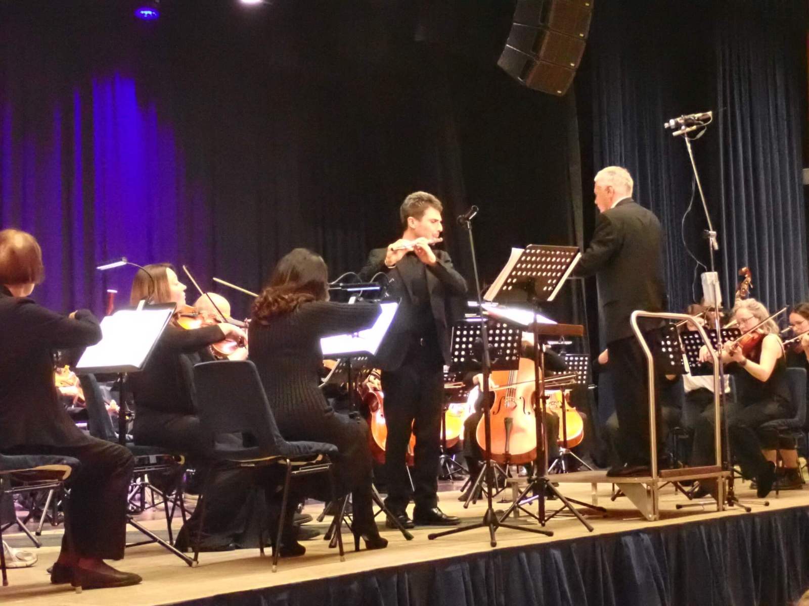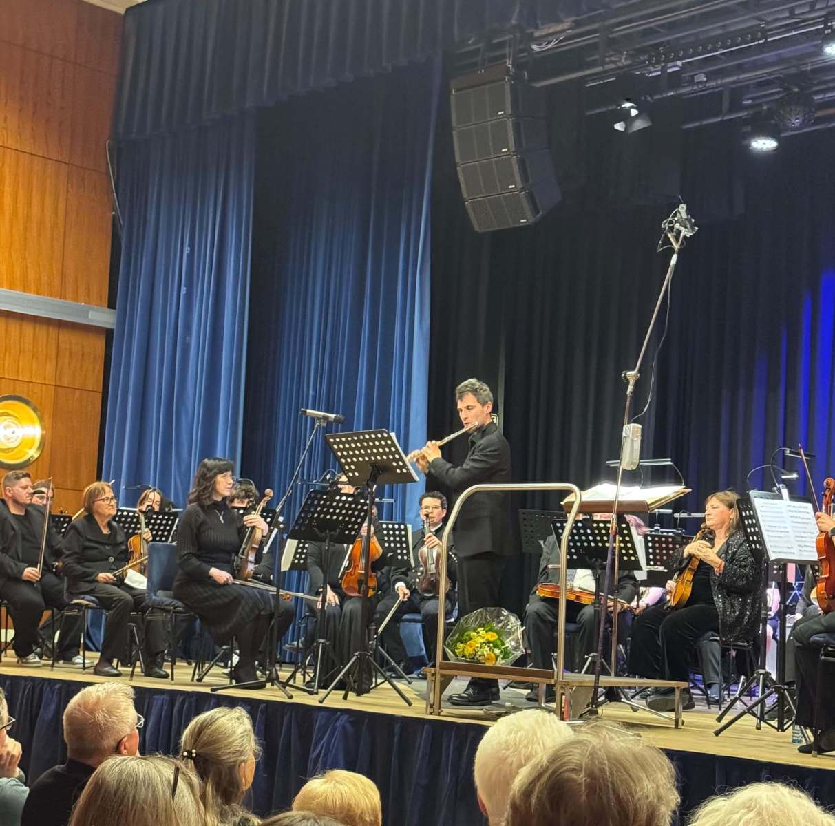 Der begeisterte Applaus ließ nicht lange auf sich warten – und Angelo Sinapi bedankte sich mit gleich zwei Zugaben. Zunächst erklang die Fantasie D-Dur op. 38 für Solo-Flöte von Friedrich Kuhlau, die den Flötisten ganz allein auf der Bühne zeigte. Hier wurde besonders deutlich, wie nuancenreich Sinapi phrasiert und wie fein er Dynamik und Klangfarbe gestaltet. Die zweite Zugabe brachte dann nochmals eine neue Energie in den Saal: „Der Hummelflug“ von Rimsky-Korsakov, diesmal gemeinsam mit dem Orchester. Rasend schnell, präzise und dennoch musikalisch kontrolliert – ein virtuoser Höhepunkt, der das Publikum hörbar mitriss.